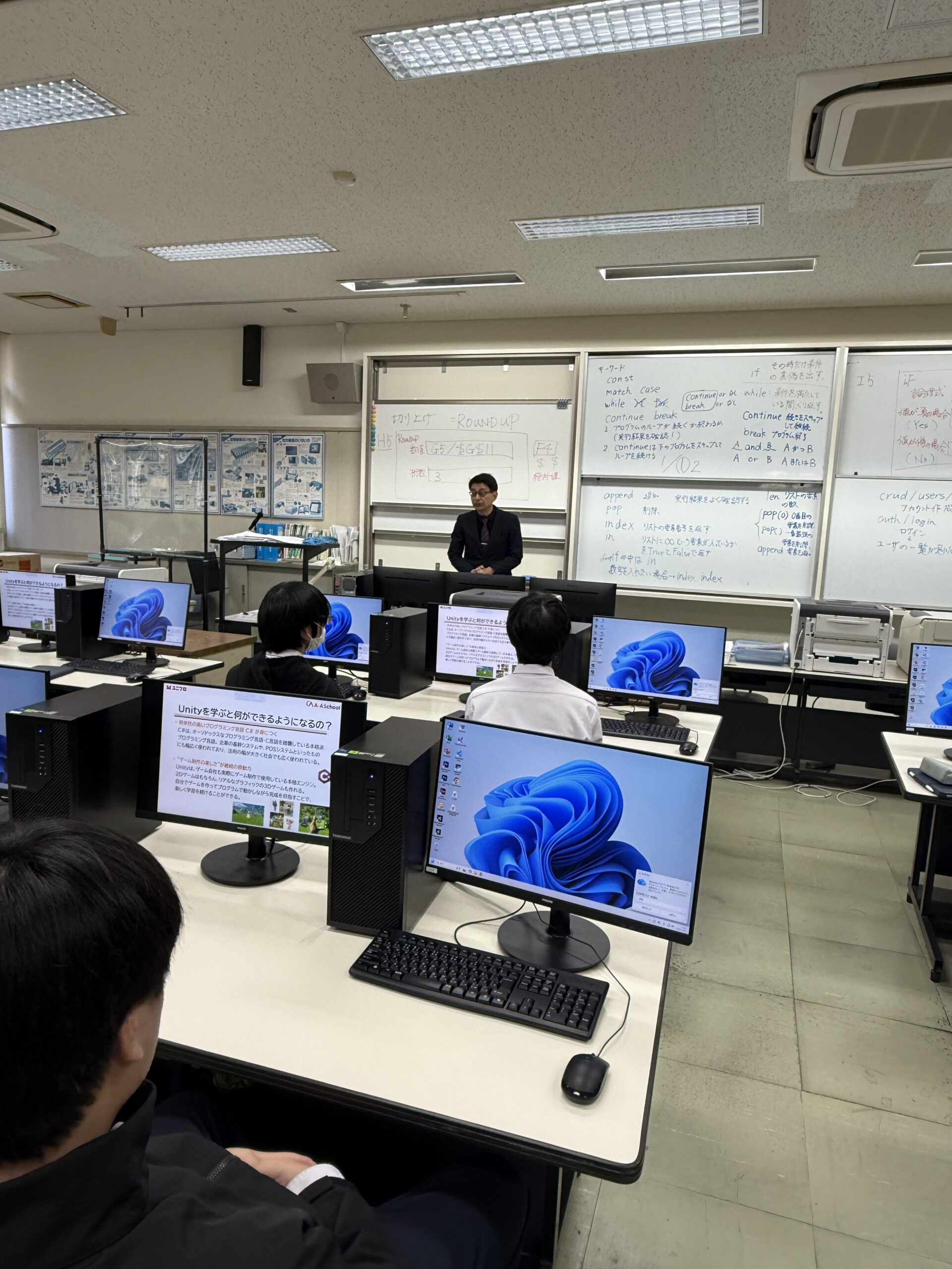 そして、6時間目の授業では、2年生からITクリエイターコースに進む予定の1年生の生徒様 約30名に向けて、Unity学習教材「ユニプロ」でどのような作品が作れるのかといったユニプロの説明や、弊社がユニプロをどのような経緯で作ったのかを話しました。