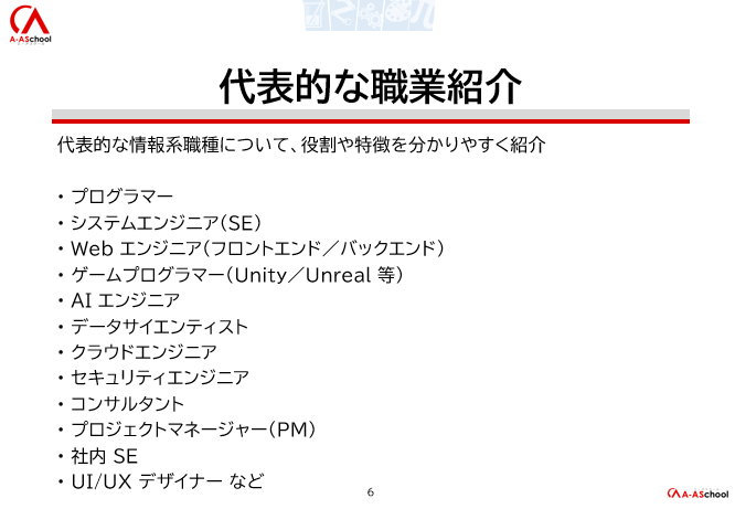 情報業界の全体像(作る仕事/課題を解決する仕事/支える仕事)を紹介し、代表の中川のSIer 時代の失敗談や、AI 時代に求められる読み解く力・問いを立てる力についてお話ししました。