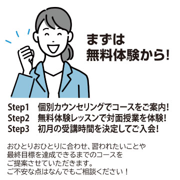 お気軽にお問合せください075-874-2709※大人開講 月~金10:00-14:00 [ 日・祝日休み] ※子供開講 火木金16:30~19:30、水16:00~19:00、土9:30~17:00 第2・4日9:30-12:45