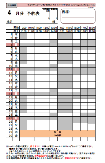 2021年3月2日 / 最終更新日 : 2021年3月6日 widetree レッスン予定 2021年4月のレッスンスケジュール 下記白枠の時間帯が受講可能な時間帯です。 GW休校のおしらせ 下記は休校とさせて頂きます。よろしくお願いいたします。 4/29(木)-5/5(水)