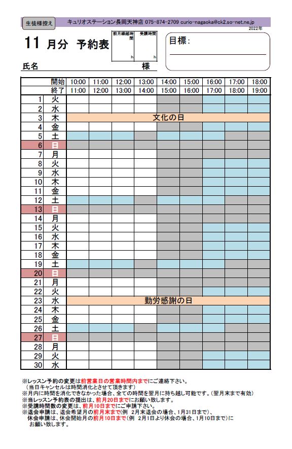 2022年11月のレッスンスケジュール