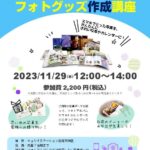 2023年10月31日 / 最終更新日 : 2023年11月9日 widetree お知らせ 11/29(水)フォトグッズ講座開催!一般参加者募集! 11月29日に一日限りのフォトグッズ作成講座を開催します!教室の生徒様の他、一般の方もぜひお気軽にご参加ください! 約2時間で、ご自身で撮影されたスマホの写真などを使ってオリジナルフォトブックや、来年の2024年のカレン […]