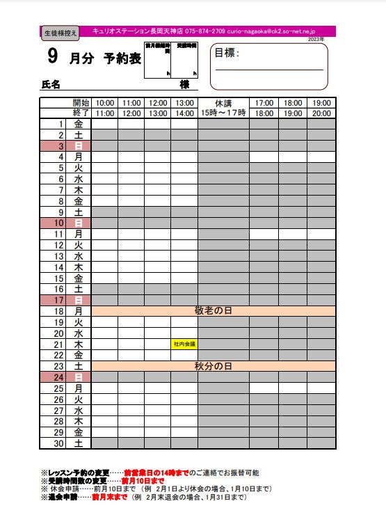 9/21(木)13時~14時は社内会議の為、レッスンをご予約いただけません。