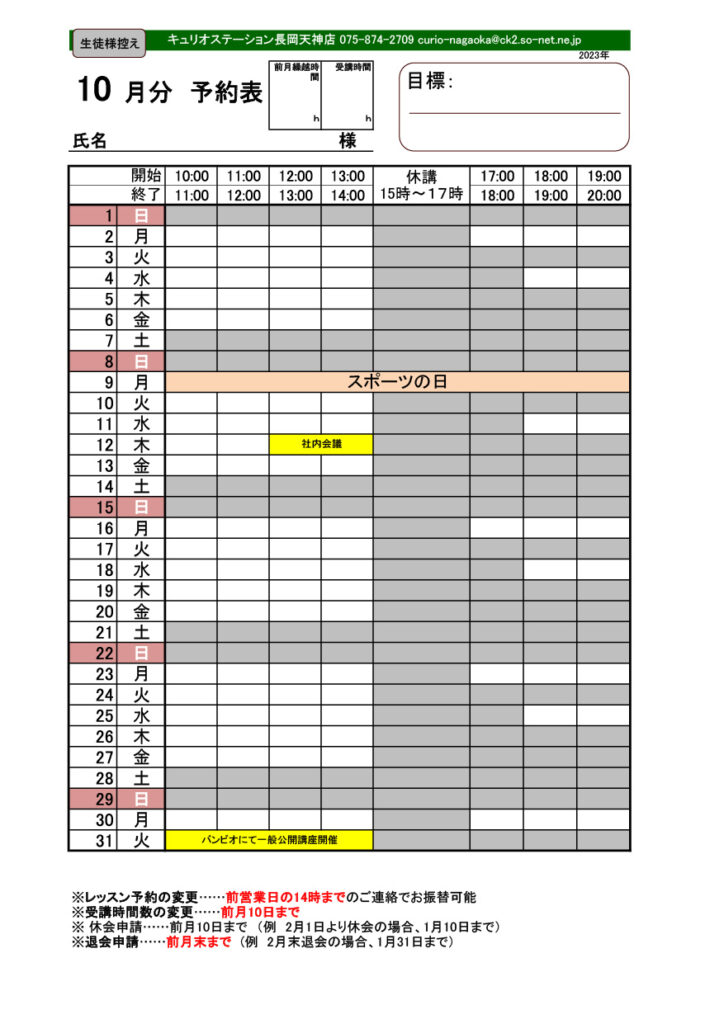 2023年10月のレッスンスケジュール