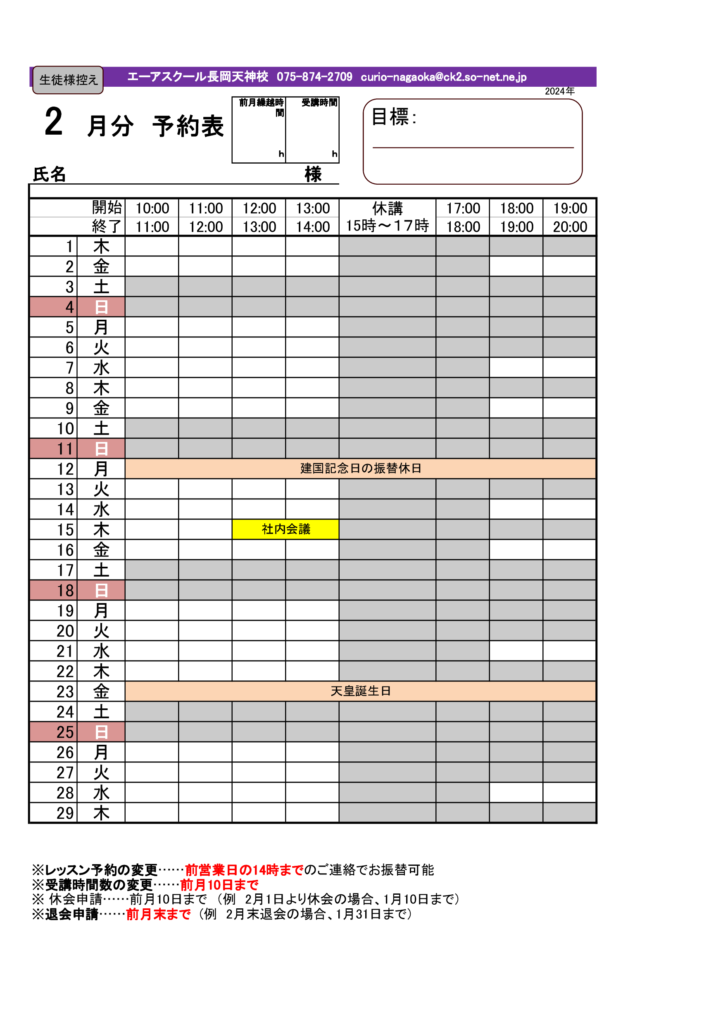 2023年12月20日 / 最終更新日 : 2024年1月5日 widetree レッスン予定 2024年2月のレッスンスケジュール 2/15(木)12時~14時は社内会議の為、レッスンをご予約いただけません。 受講可能な時間帯 ・下記白枠の時間帯