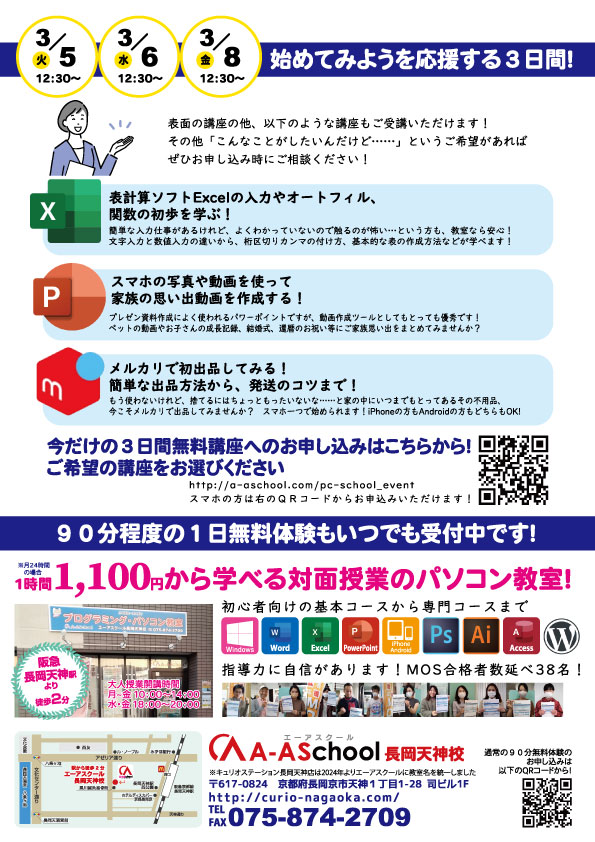 2024年2月16日 / 最終更新日 : 2024年2月16日 widetree お知らせ 3日間無料体験講座開催! 3月5日(火)12:30~14:003月6日(水)12:30~14:003月8日(金)12:30~14:00 の3日間にかけて、3日間特別無料体験講座を開催いたします!通常1回90分の無料体験講座が今回だけ3日間受けられます!ぜひこの機会に「ずっとやってみたいと思っていたけれど勇気がでなくて1歩踏み出せなかったこと」に挑戦してみませんか?お申し込みは以下のフォームから! 3日間無料体験講座お申込みフォーム