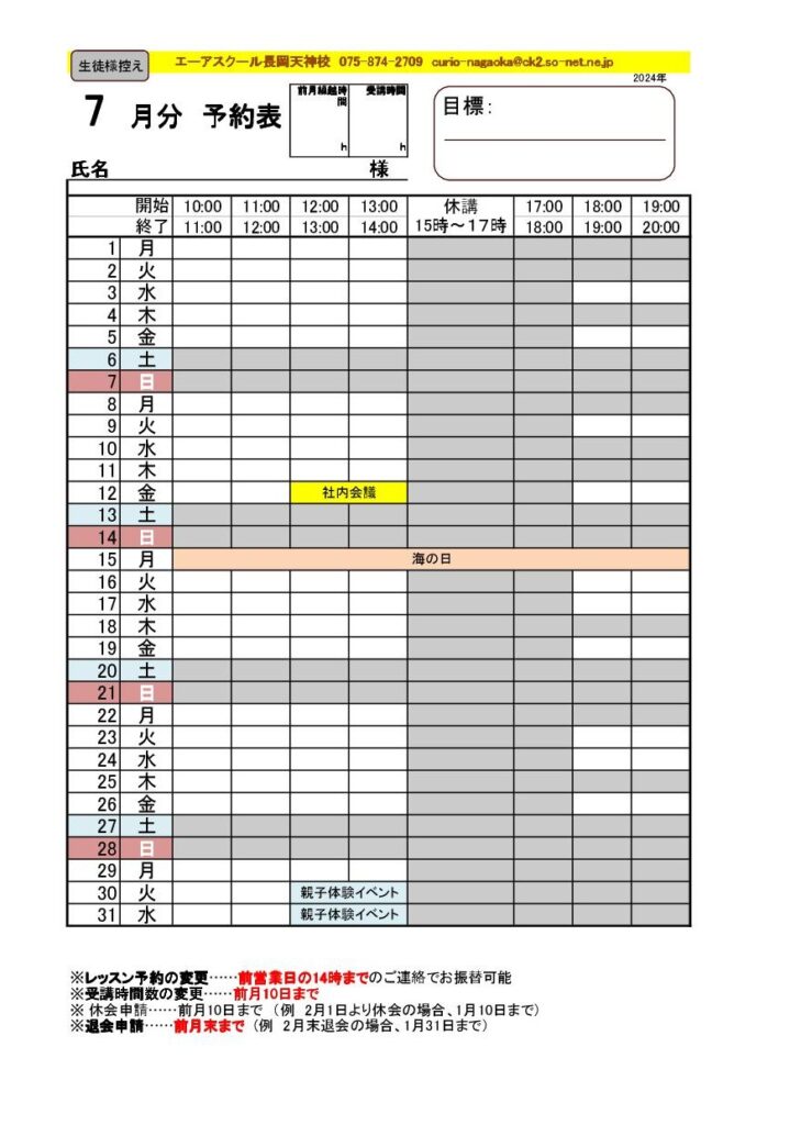 7月のレッスンスケジュール