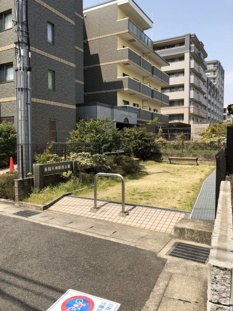 | 曲がるとすぐに、右側に小さな公園「長岡天神駅西公園」が見えます。 |
