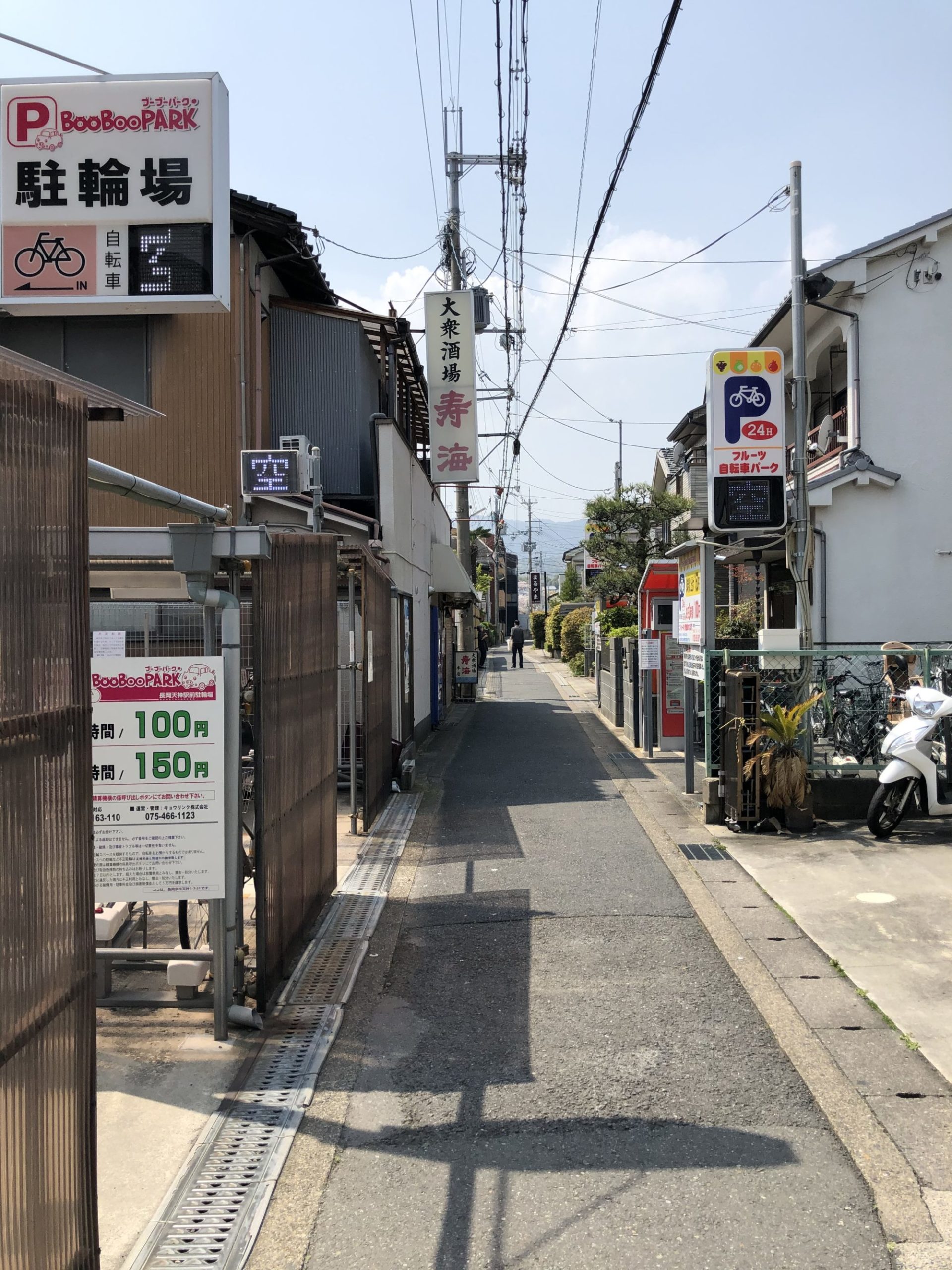 | 曲がるとすぐに、右側に小さな公園「長岡天神駅西公園」が見えます。 |
