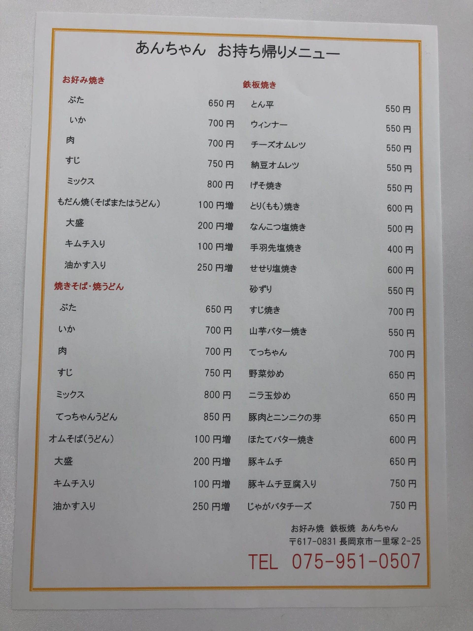 長岡京市のお好み焼き屋「あんちゃん」お持ち帰り対応されています