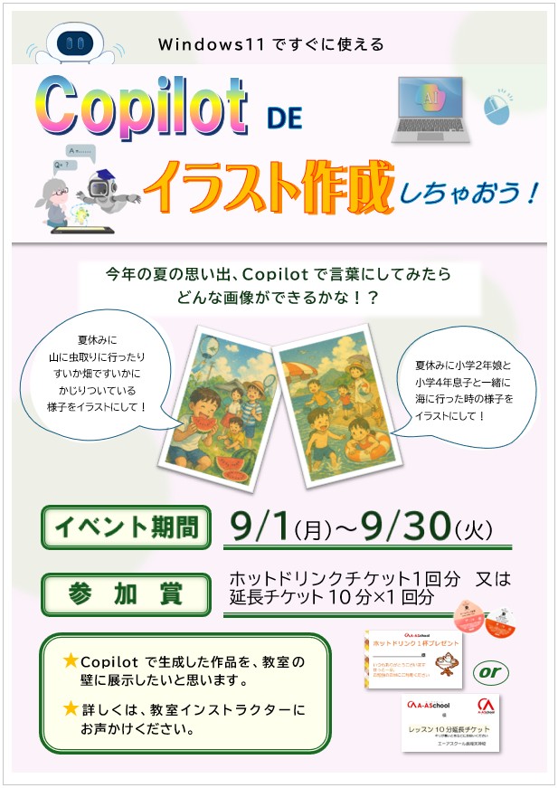 ただいま、エーアスクール長岡天神校では、生徒様向けのイベントとして、「Copilotでイラスト作成イベント」を開催中です!