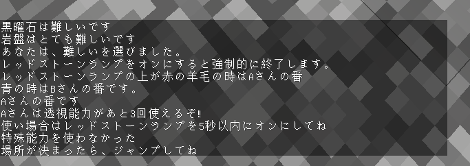 レッドストーンランプの上のブロックが青の羊毛の時はBさんの番らしいです。