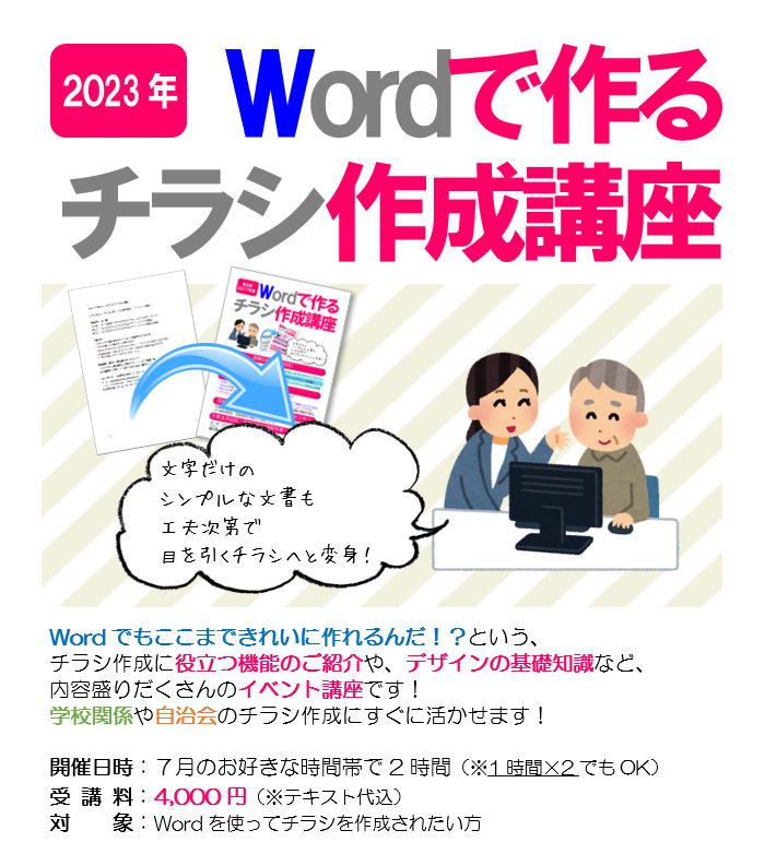 7月は、皆様のご要望にお応えして「Wordで作るチラシ作成講座」を開催いたします![]()