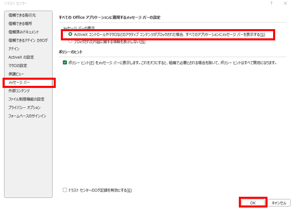 表示された画面で「メッセージバー」の設定を「ActiveXコントロールやマクロなどのアクティブコンテンツがブロックされた場合、すべてのアプリケーションにメッセージバーを表示する」を選択し、「OK」します。
