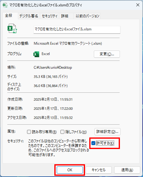 表示されたプロパティ画面で、セキュリティの項目の「許可する」にチェックを入れ、「OK」してください。