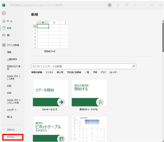 Excelを起動したときにあらわれる最初の画面で左下の「オプション」をクリックします。