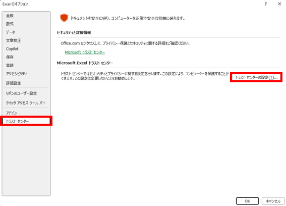 開かれた「Excelのオプション」ウィンドウの「トラストセンター」をクリックし、表示された画面で「トラストセンターの設定」をクリックします。