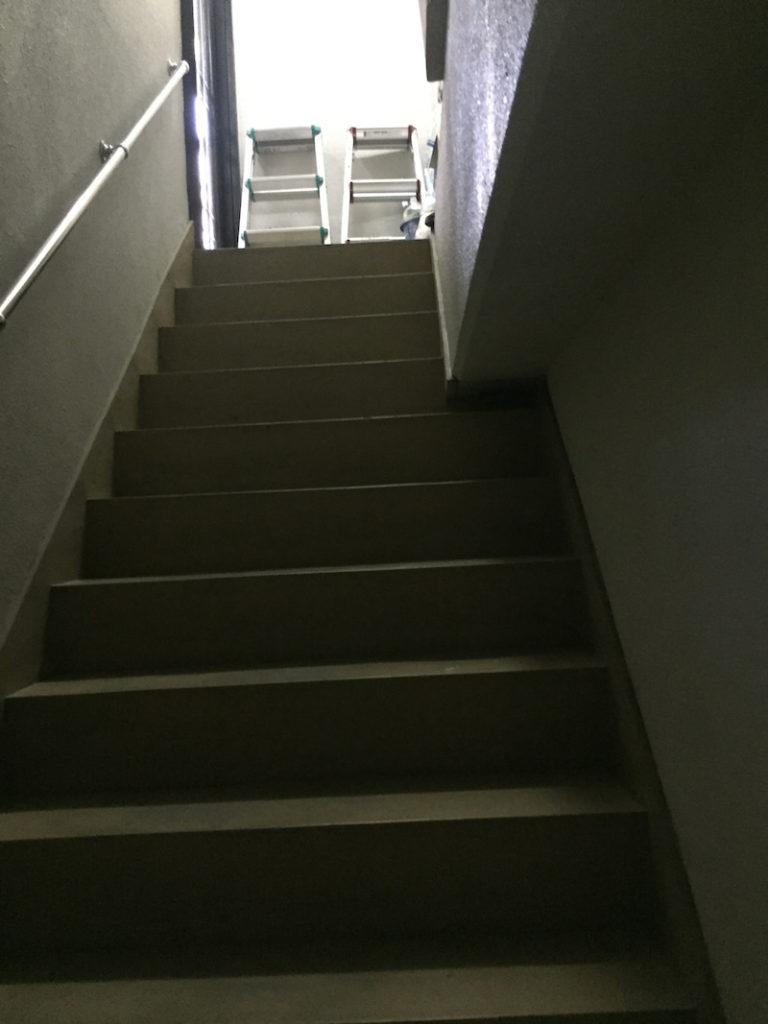 (10)非常口を開けると、こんな感じで、上にあがる階段が見えます。
