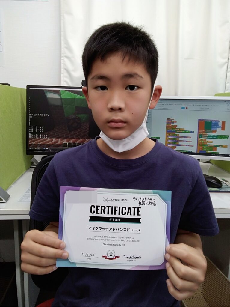2021年6月4日 / 最終更新日 : 2021年6月4日 widetree その他 全マイクラッチコース修了おめでとうございます 小5から3年間プログラミングレッスンに通い続けてくれたM君。 全マイクラッチコース修了で卒業です。 3年間とても頑張ってくれました。 寂しくなりますが、今後の活躍をインストラクター一同祈っております。 Y君お疲れさまでした! プログラミングで習ったことをぜひ今後に活かしてくださいね!