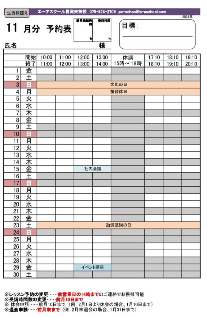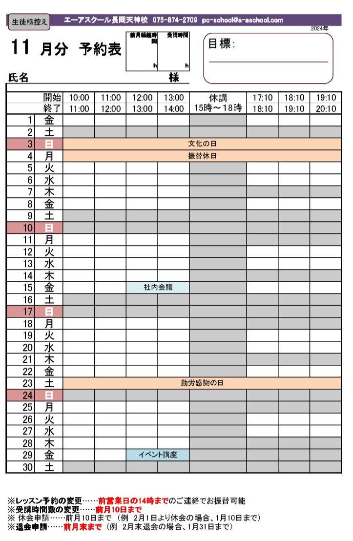 2024年10月1日 / 最終更新日 : 2024年10月2日 widetree 11月のレッスンスケジュール 受講可能な時間帯…下記白枠の時間帯※祝日につき、11月4日(振替休日)は休校となっております。※社内会議の為、11月15日(金)の12時~14時は休講となっております。