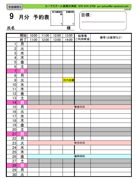 ※祝日につき、9月15日(敬老の日)と9月23日(秋分の日)は休校となっております。