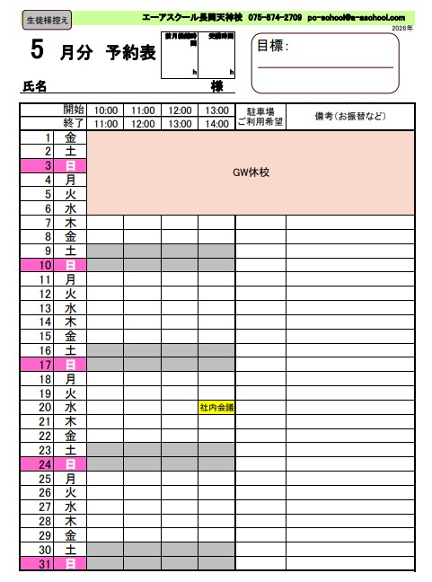 2026年4月1日 / 最終更新日 : 2026年3月23日 widetree 5月のレッスンスケジュール 受講可能な時間帯…下記白枠の時間帯※社内会議の為、5月20日(水)の13時~14時は休講となります。※4月29日(水)~5月6日(水)はGW休校となっております。