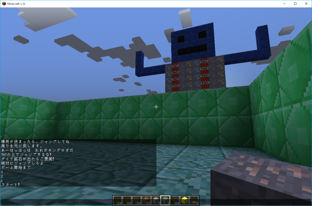 2人でバトルできるようにカスタマイズし、いろんな工夫が見られました。どちらの順番か分かるようにブロックで表示して視覚的にわかりやすくしたり、透視能力を使って地面のブロックが分かるような仕組みを入れたり、「かぼちゃ」を掘り当てれれば、何らかのイベントが発生するようにしたり、とにかく楽しめる要素をたくさん盛り込んでくれました。