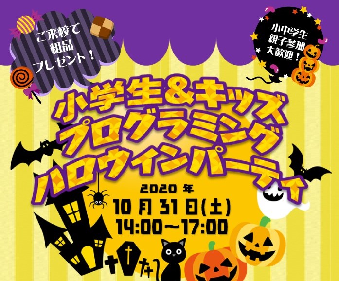 2020年10月28日 / 最終更新日 : 2020年10月28日 widetree ハロウィンイベント今年は感染対策を行いながら実施します ハロウィンイベント2020 10/31(土)14時より、時間制限、人数制限しながらハロウィンイベント実施します。 2020-年全国プログラミングコンテスト優勝作品など、生徒さんが作った作品を展示します。ぜひお越し下さい。 インストラクターの先生が作ったゲームも展示します。