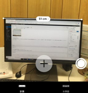 アプリを起動したときに出てくる円の中心にある丸印を測りたい物の計測の開始位置に合わせて「+」をタップし、端末をゆっくり動かすと黄色い線が伸びていくので、計測の終了位置まで移動させて、もう一度「+」をタップします。すると・・・