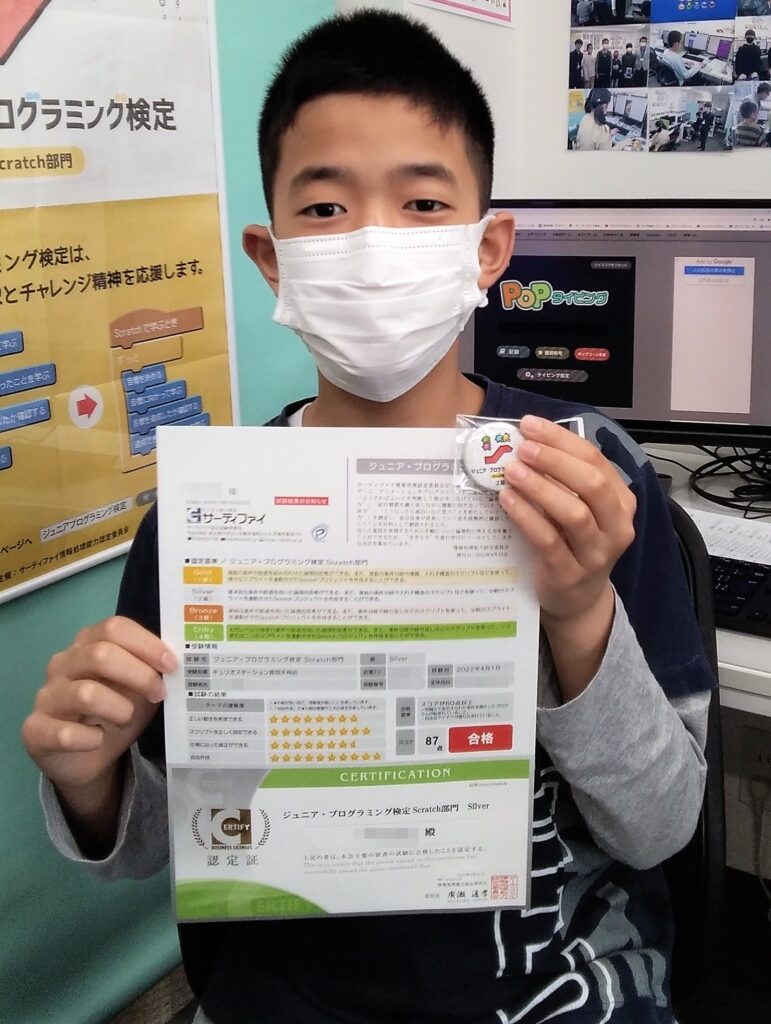 マイクラッチjrコースから始められ、現在アドバンスドコースまで進まれたO君が、この度春休みを利用してジュニアプログラミング検定対策に取り組まれ、見事シルバー級に合格されました!