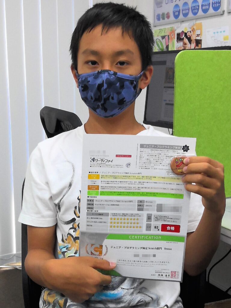 マイクラッチコースを2年8カ月ご受講中のYくんが、ファーストコース修了後ジュニア・プログラミング検定のブロンズ級対策コースに進まれ、今回見事92点という高得点で合格されました!