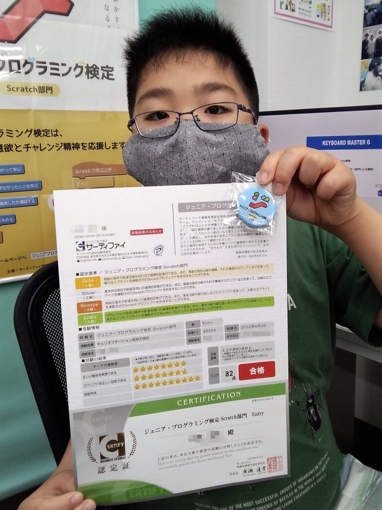 今年1月よりご入会いただきマイクラッチファーストコースをご受講中のU君が、春休み中にスクラッチ検定対策講座を受講され、早くもエントリー級に合格されました!