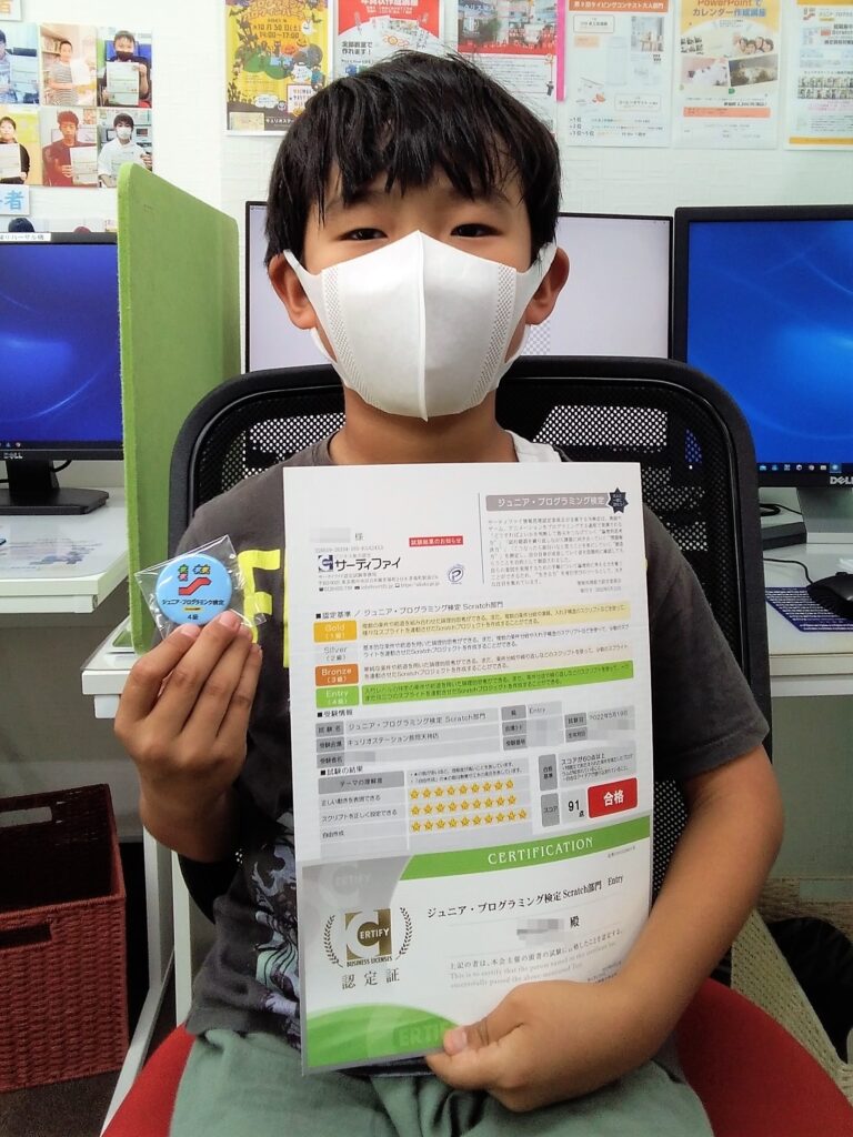 マイクラッチジュニアコースを修了されたN君が、今回ジュニアプログラミング検定に初挑戦され、見事合格されました😊