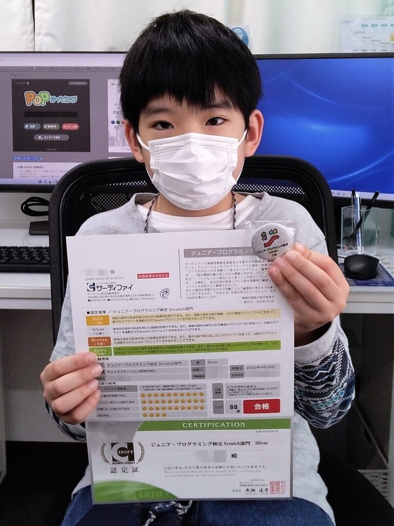 サマーキャンプなど短期集中講座から始められ、昨年秋よりスクラッチコースをご受講されていたI君が、今回初めてジュニアプログラミング検定に初挑戦され、1回目で見事シルバー級に合格されました!😊👏✨