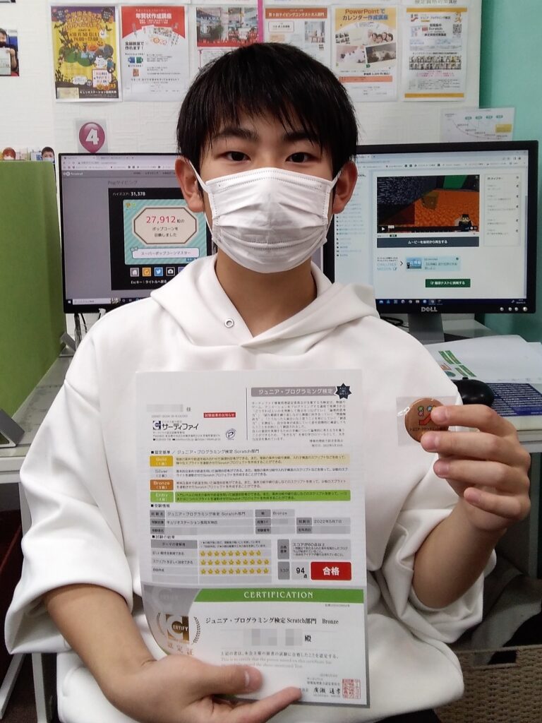 マイクラッチコースをご受講中のT君が、セカンドコースを修了され、この度見事ブロンズ級に合格されました😊
