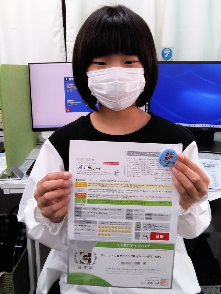 マイクラッチジュニアコースをご受講されていたNさんが、この度ジュニアコースを修了され、ジュニアプログラミング検定のエントリー級に初挑戦され、合格されました!