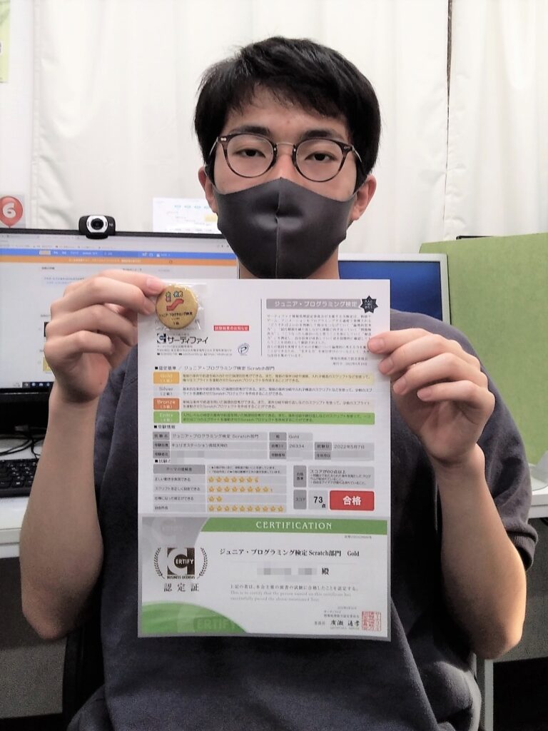 マイクラッチアドバンスコースをご受講されていたT君が、春休みを利用して短期集中でScratch検定対策コースを受講され、この度見事ゴールド急に合格されました😊