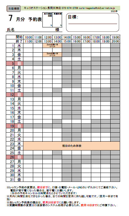 2020年7月レッスンスケジュール