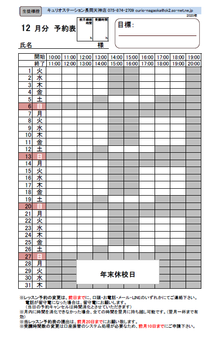 2020年11月20日 / 最終更新日 : 2020年12月16日 widetree レッスン予定 2020年12月のレッスンスケジュール 令和2年12月28日(月)~令和3年1月4日(月)まで冬季休業とさせていただきます。 よろしくお願い致します。