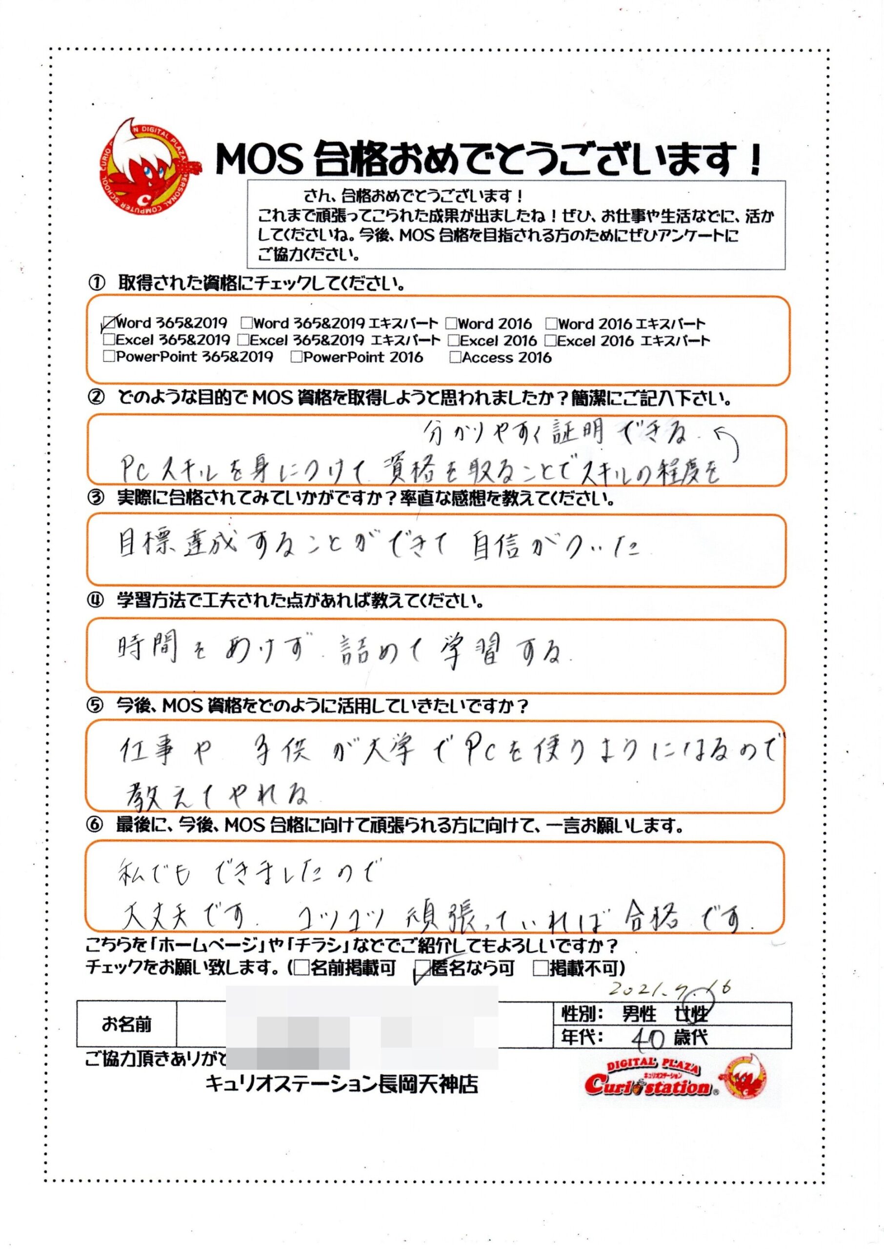 2021年8月7日 / 最終更新日 : 2022年9月22日 widetree MOS資格やその他検定資格 MOSWord 合格おめでとうございます!! 7月、当教室からはお二人の方がMOS Word (365&2019)試験に合格されました お一人は前回ご紹介したKさん、そして今回ご紹介するNさんですお二人とも高得点での合格でした Nさんは2月のエクセルに引き続きワードでの合格となりましたおめでとうございます これからはお仕事でワード、エクセルを活かしていかれるとのことです。Nさんの今後のご活躍を心よりお祈りしております