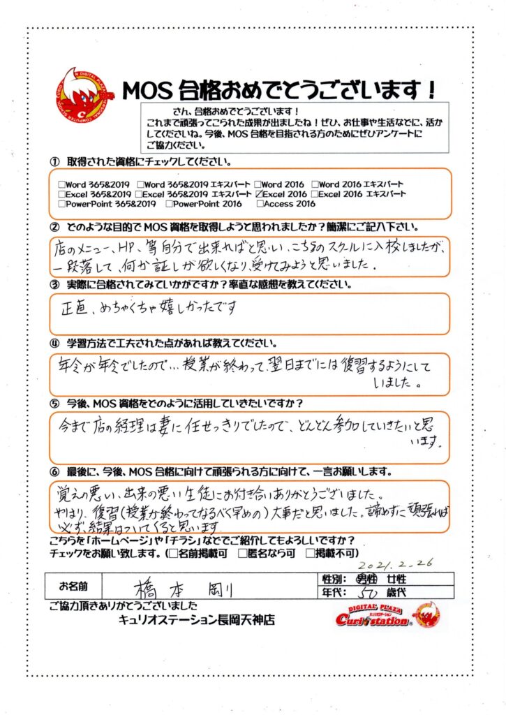 2021年3月11日 / 最終更新日 : 2025年12月8日 widetree MOS資格やその他検定資格 MOS合格者インタビュー(Excel2016スペシャリスト合格Hさん) お好み焼き屋「あんちゃん」さんを経営されながら、1年半かけてじっくりと対策に取り組んでいただき、見事合格されました橋本様。 忙しい中、合格を目指して学習されたときの工夫などをお聞かせ頂きました。 合格を目指される方参考にぜひご覧ください。