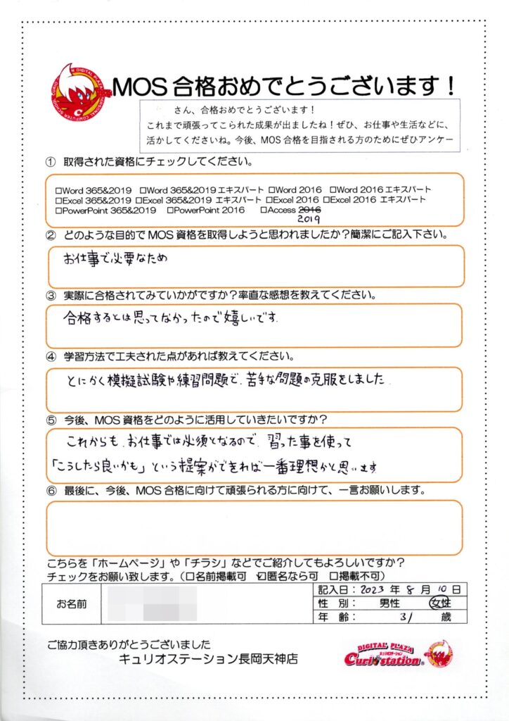 2023年8月17日 / 最終更新日 : 2023年8月17日 widetree MOS資格やその他検定資格 MOSAccess2019エキスパート 合格! 以前のMOSWord2019、MOSExcel2019の合格に引き続き、Accessコースに進まれ、見事約2カ月でMOS対策を終えてMOSAccess2019エキスパートに合格されました!3つ目のMOS資格取得、おめでとうございます!引き続き専門コースで学習を続けられる予定です😊 お仕事で必要なためMOS資格を取得しようと思いました。合格するとは思ってなかったので嬉しいです。とにかく模擬試験や練習問題で苦手な問題の克服をしました。これからもお仕事では必須となるので、習った事を使って「こうしたら良いかも」という提案ができれば一番理想かと思います。
