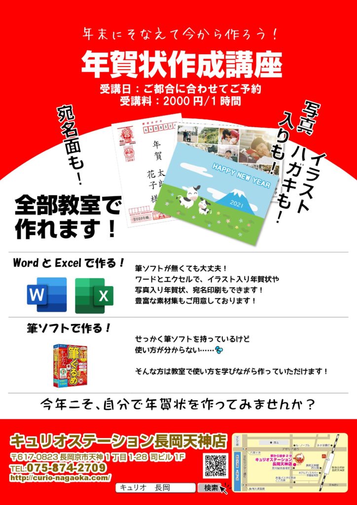 2020年9月30日 / 最終更新日 : 2020年10月3日 widetree お知らせ 生徒様向け 年賀状講座のご案内 教室の生徒様へのご案内です。 お好きな時間帯で、1時間から年賀状講座の受講をご予約いただけます。 詳しくはご来校時にインストラクターまでお尋ねください