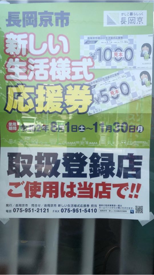 当店は長岡京市新しい生活様式応援券の取扱事業者です