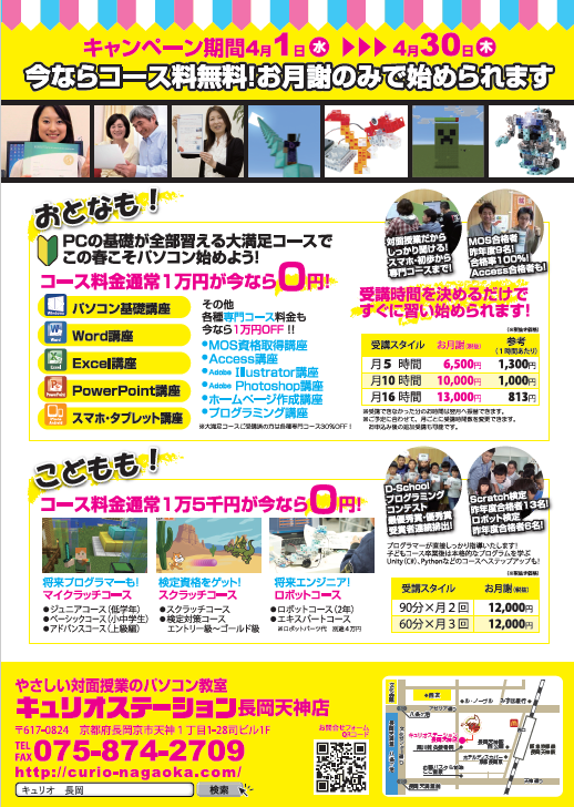 このたび、長岡京市のパソコン教室・キュリオステーション長岡天神店は、業務拡大と生徒様の利便性向上のため、2020年4月1日(水)に教室を移転し、リニューアルオープンいたします![]()