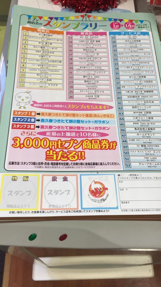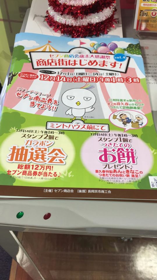 2019年12月4日 / 最終更新日 : 2019年12月21日 widetree その他 セブン商店会がスタンプセール中 教室長の中川です。 セブン商店会がスタンプセール中 今年もやって参りました、セブン商店会の歳末大感謝祭😆 スタンプラリーで、抽選で10名様に3000円のセブン商品券が当たります😆 そして、なんと今年も美味しいと大好評の、和菓子屋さんの「喜久春」のつきたて2色餅(あんときなこ)もあたります。 こちらは、先着500名様です。 (お餅プレゼントは、12/14土 午後1時〜午後3時) ぜひご参加下さいませ〜。 当教室でもスタンプ押してますよ~。 セブン商店会歳末イベント セブン商店会歳末イベント