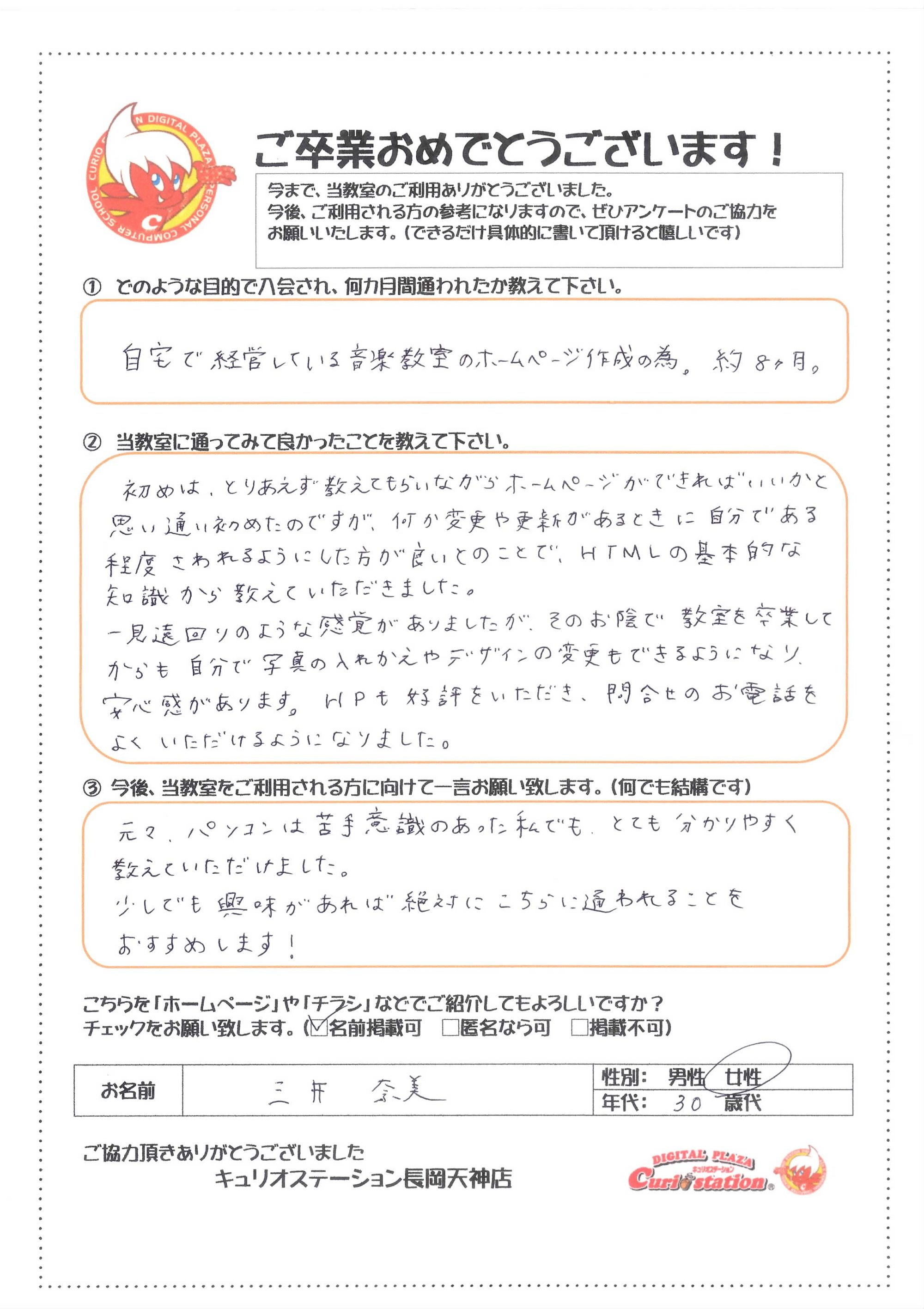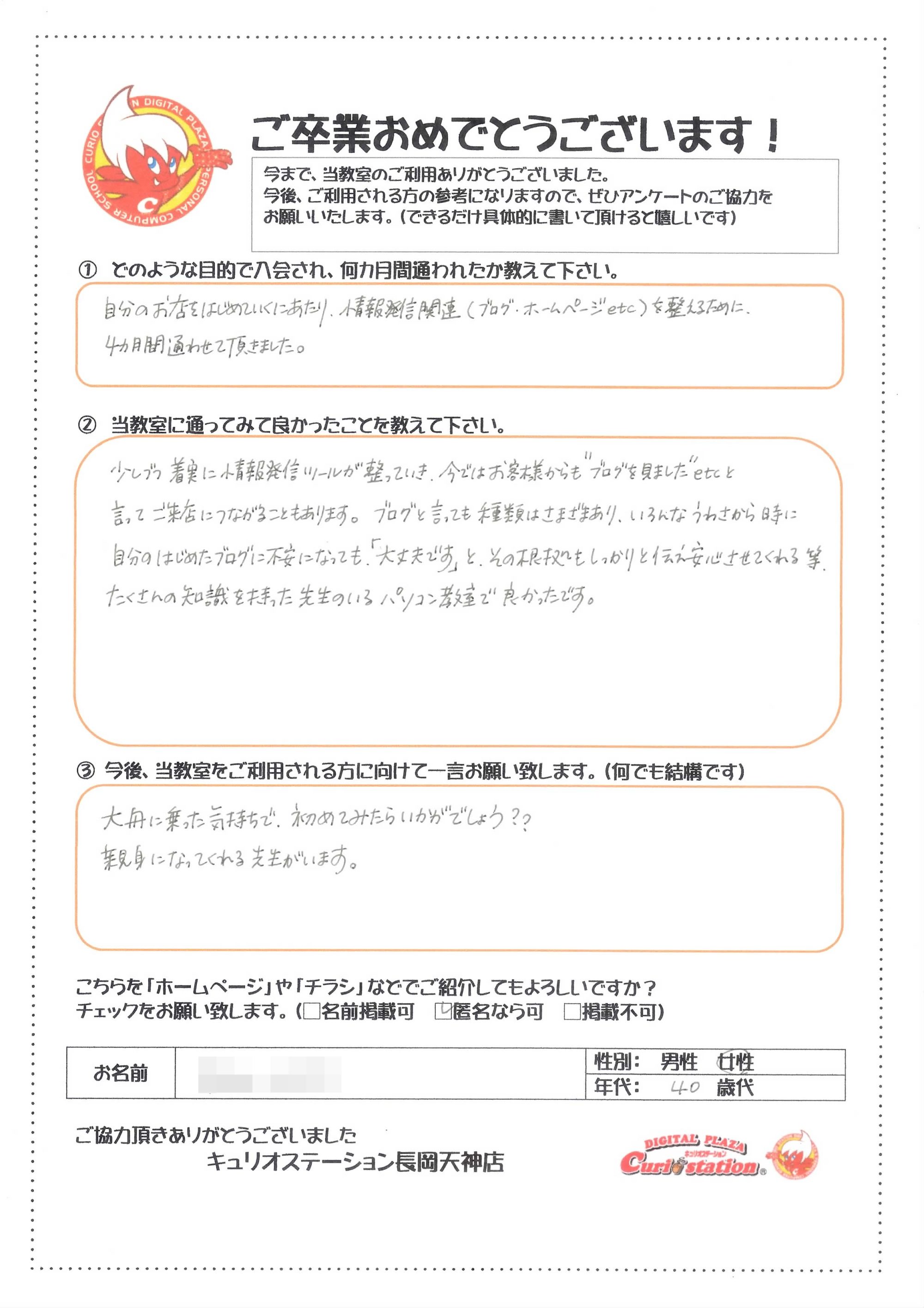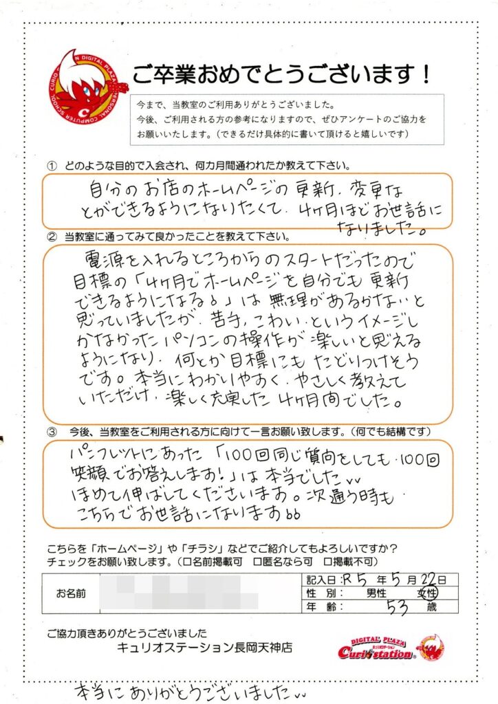 HPも好評をいただき、問い合わせのお電話をよくいただくようになりました。元々、パソコンは苦手意識があった私でもとても分かりやすく教えていただけました。少しでも興味があれば絶対にこちらに通われることをおすすめします。