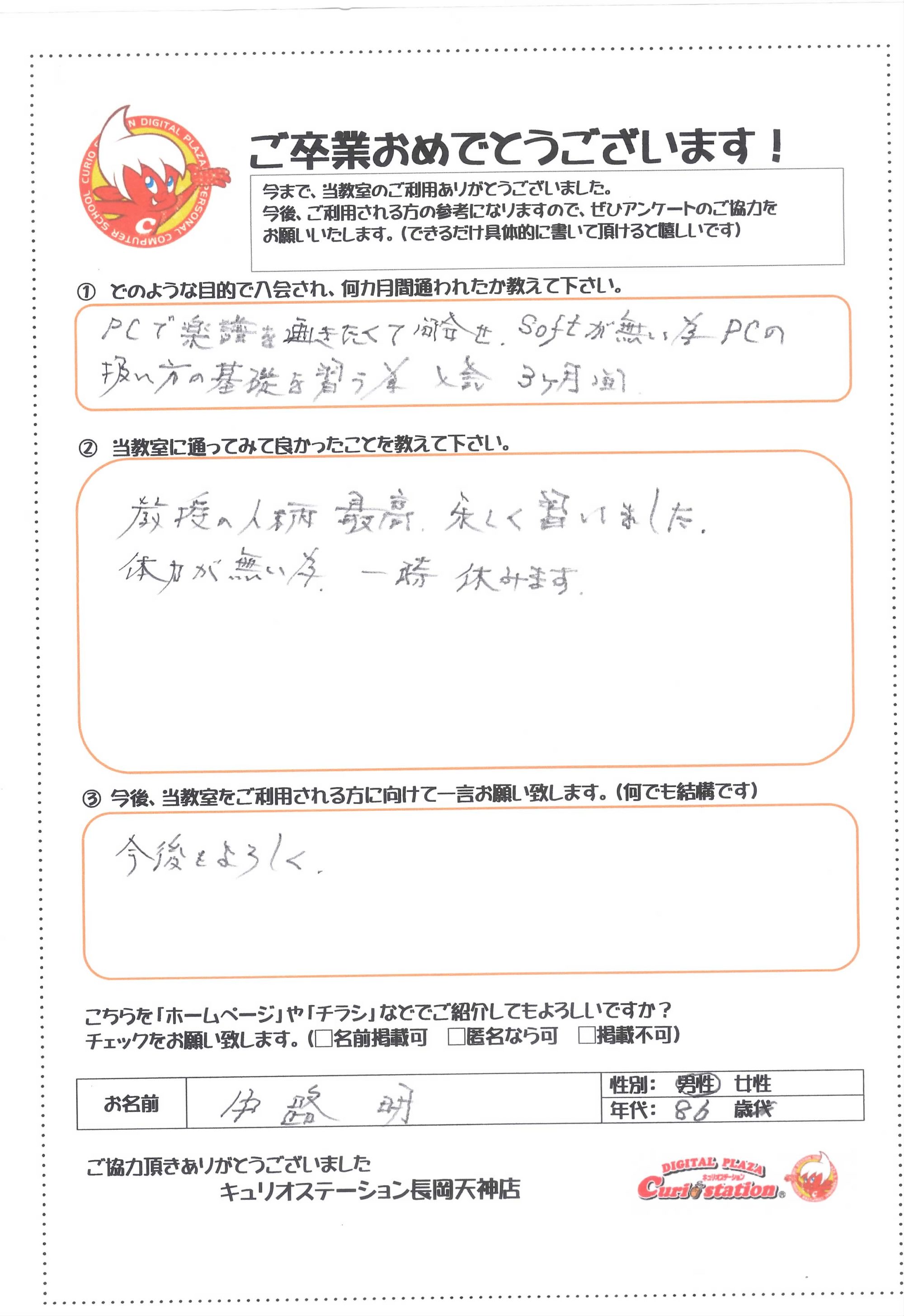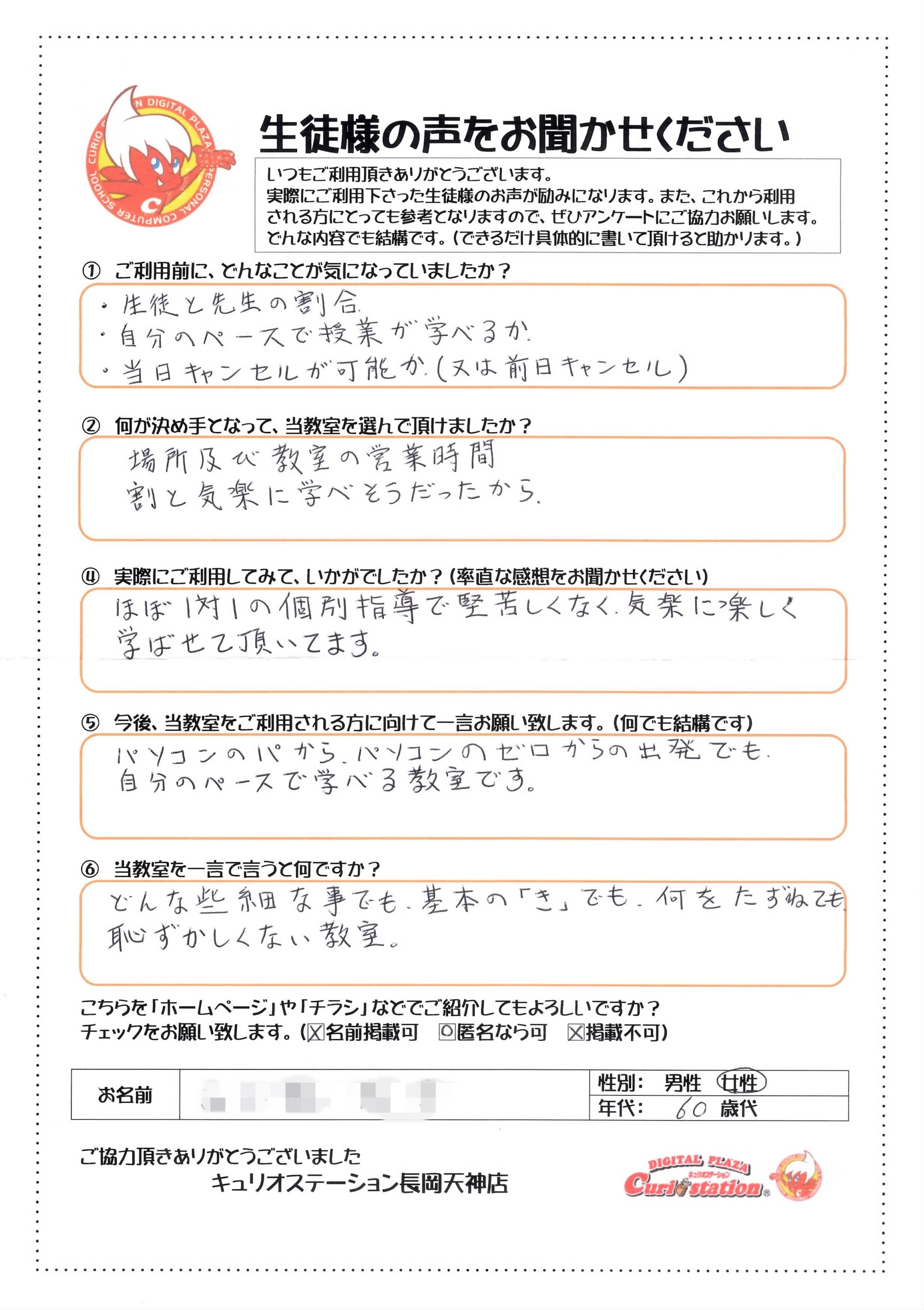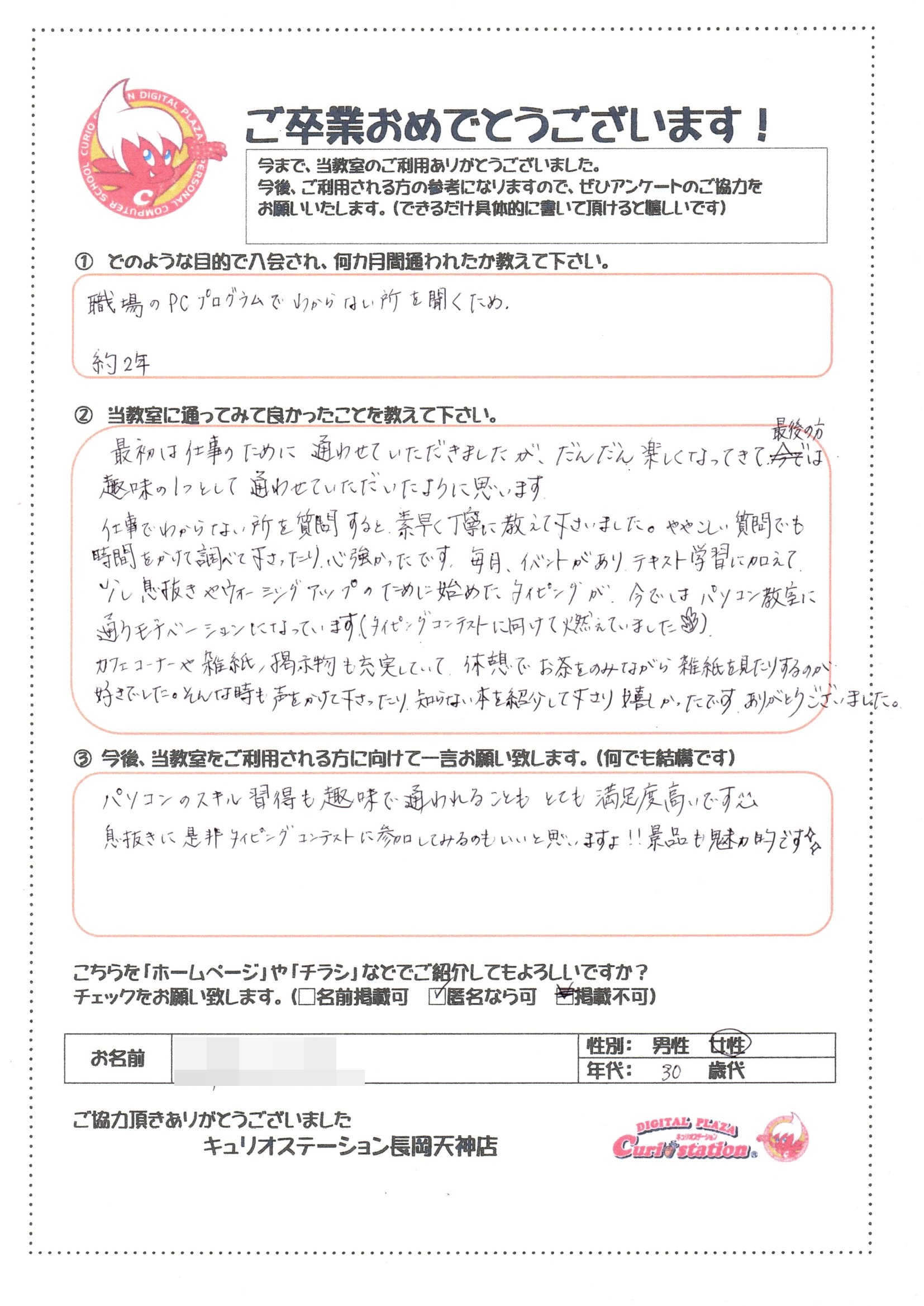 Q.実際にご利用されてみていかがでしたか?A.ほぼ1対1の個別指導で堅苦しくなく気楽に楽しく学ばせていただいてます。パソコンのパから、パソコンのゼロからの出発でも自分で学べる教室です。Q.当教室をひとことで言うと?