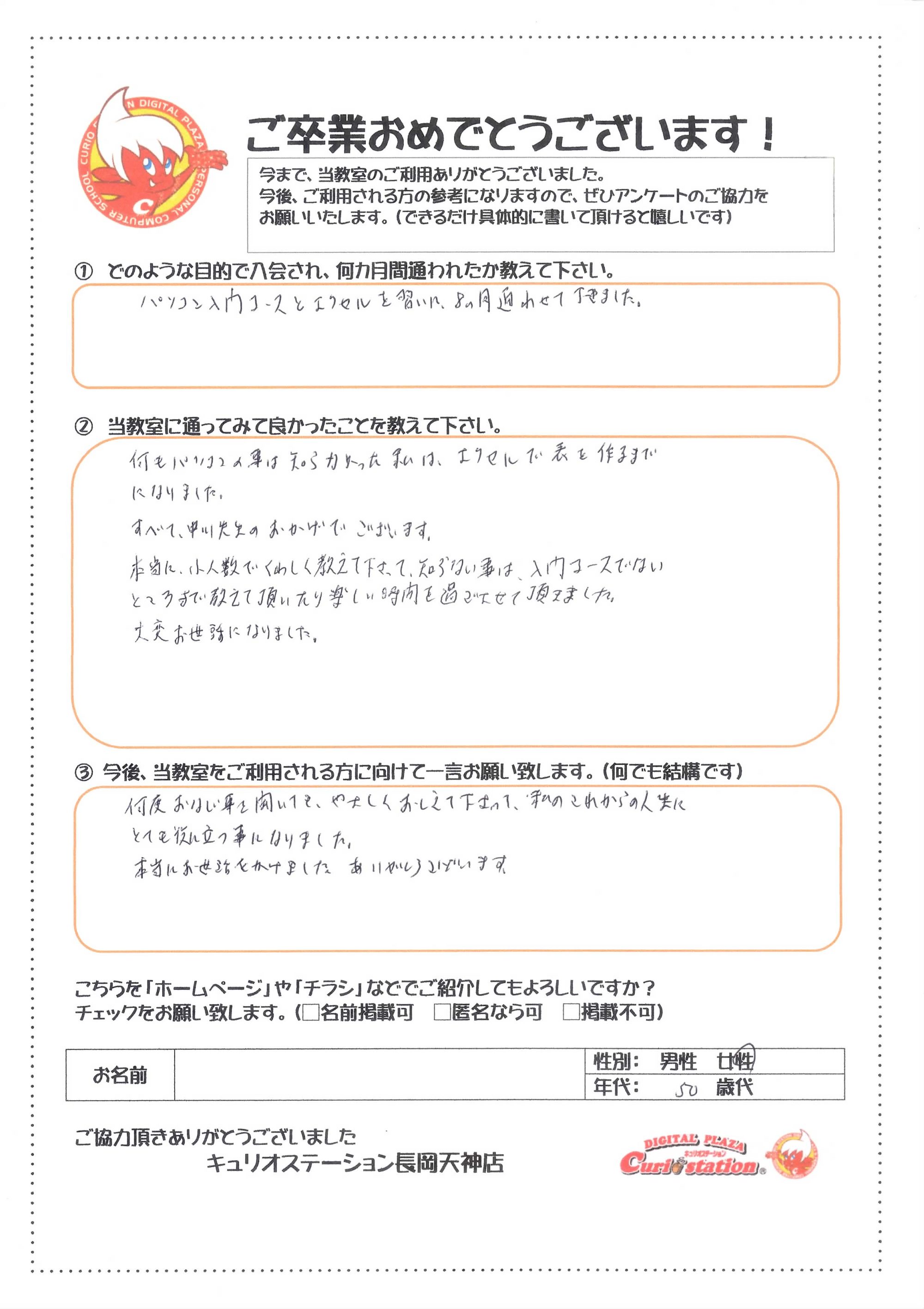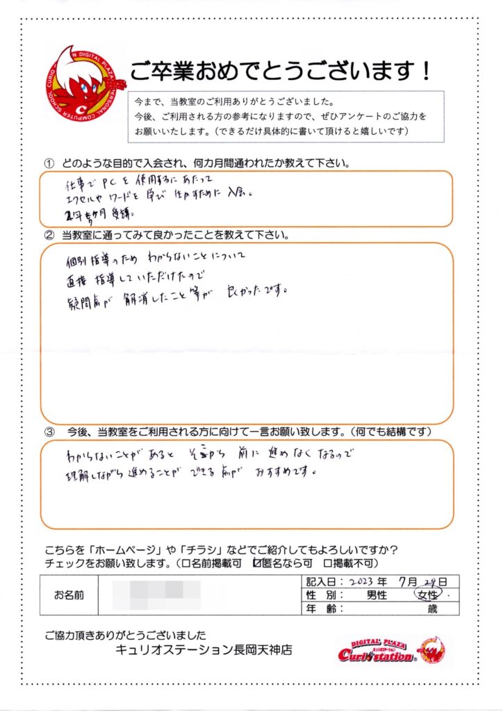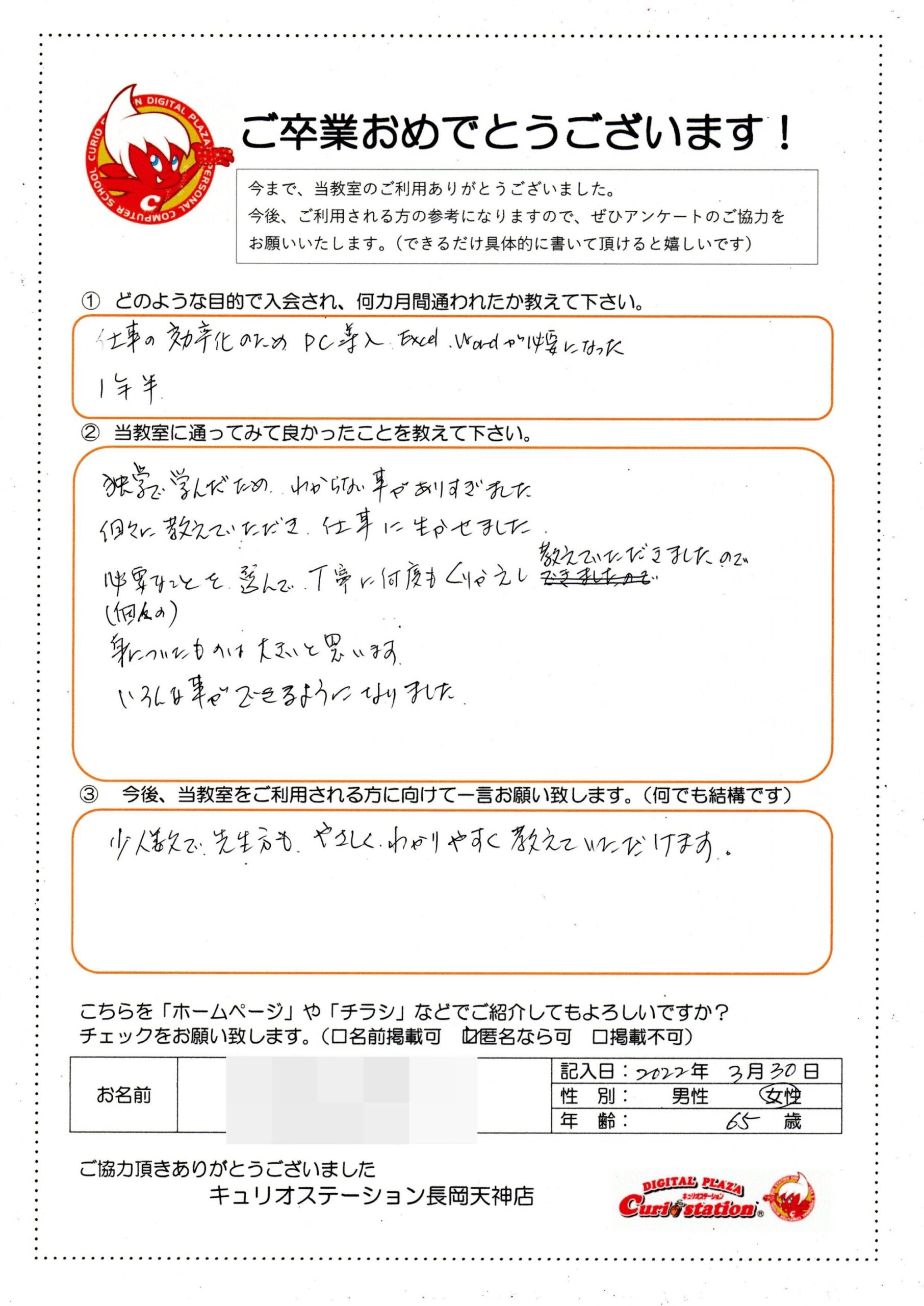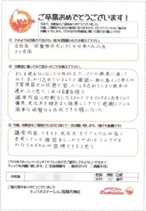 パソコンを基礎から学びたくて入会しました。少人数制でどんな些細な事でも気軽に質問できる教室で良かったです。何度同じ事を聞いても丁寧に教えてもらえるのでマイペースに学べることができ、楽しく通えると思います。