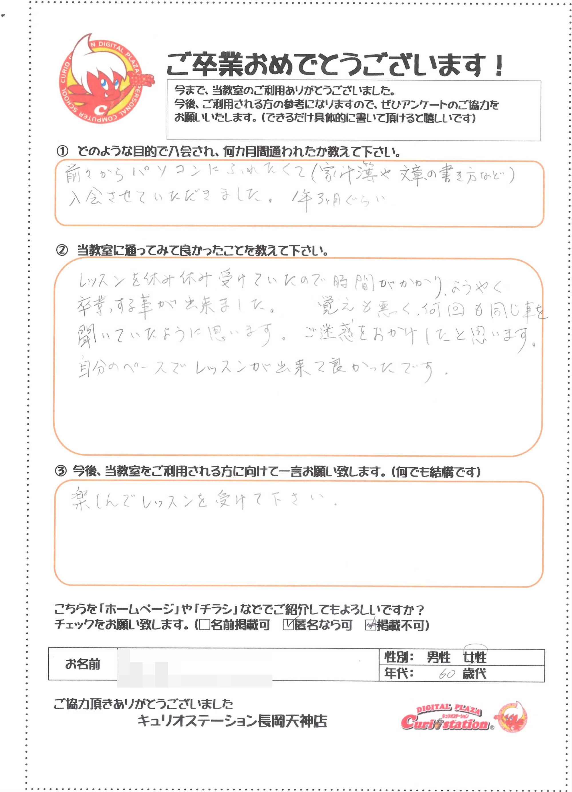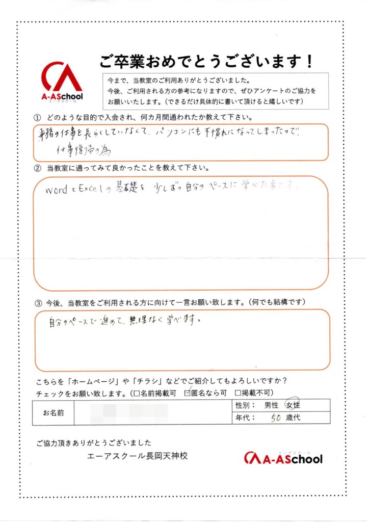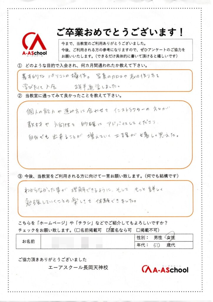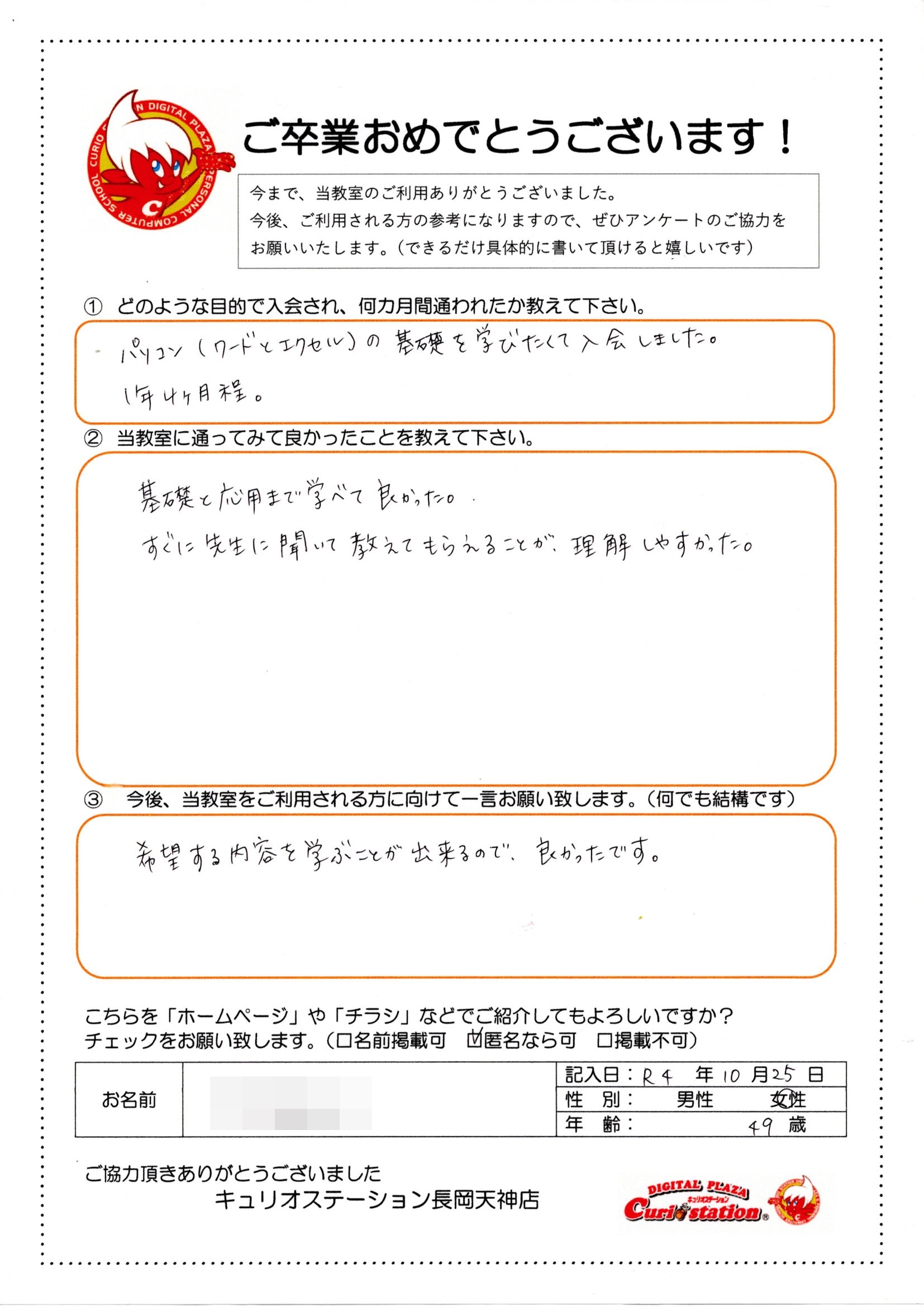 パソコンを基礎から学びたくて入会しました。少人数制でどんな些細な事でも気軽に質問できる教室で良かったです。何度同じ事を聞いても丁寧に教えてもらえるのでマイペースに学べることができ、楽しく通えると思います。